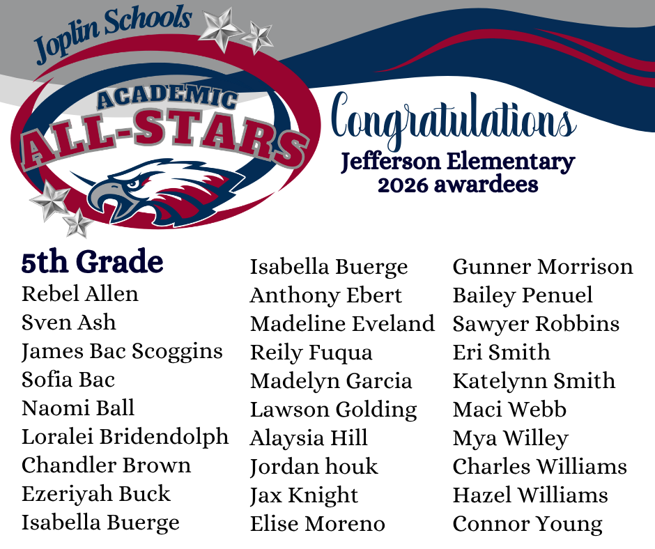 Congratulations to our 2026 Academic All Stars! These students worked hard to earn Advanced, Proficient, and Growth scores on last year's MAP tests, and we are so proud of them. Thank you to our teachers and families for supporting your students to strive for academic success.